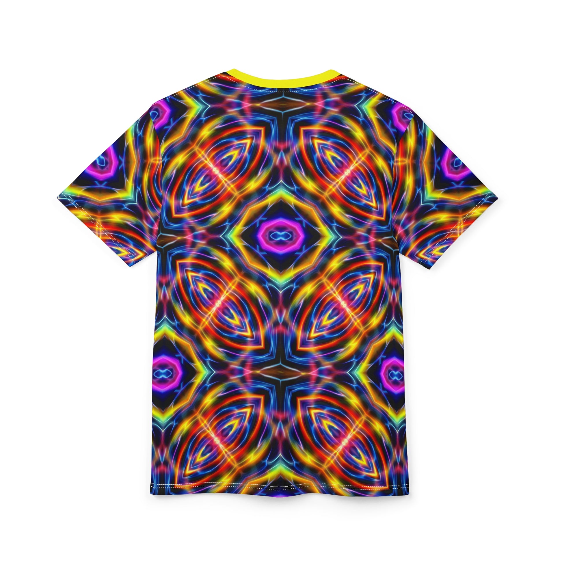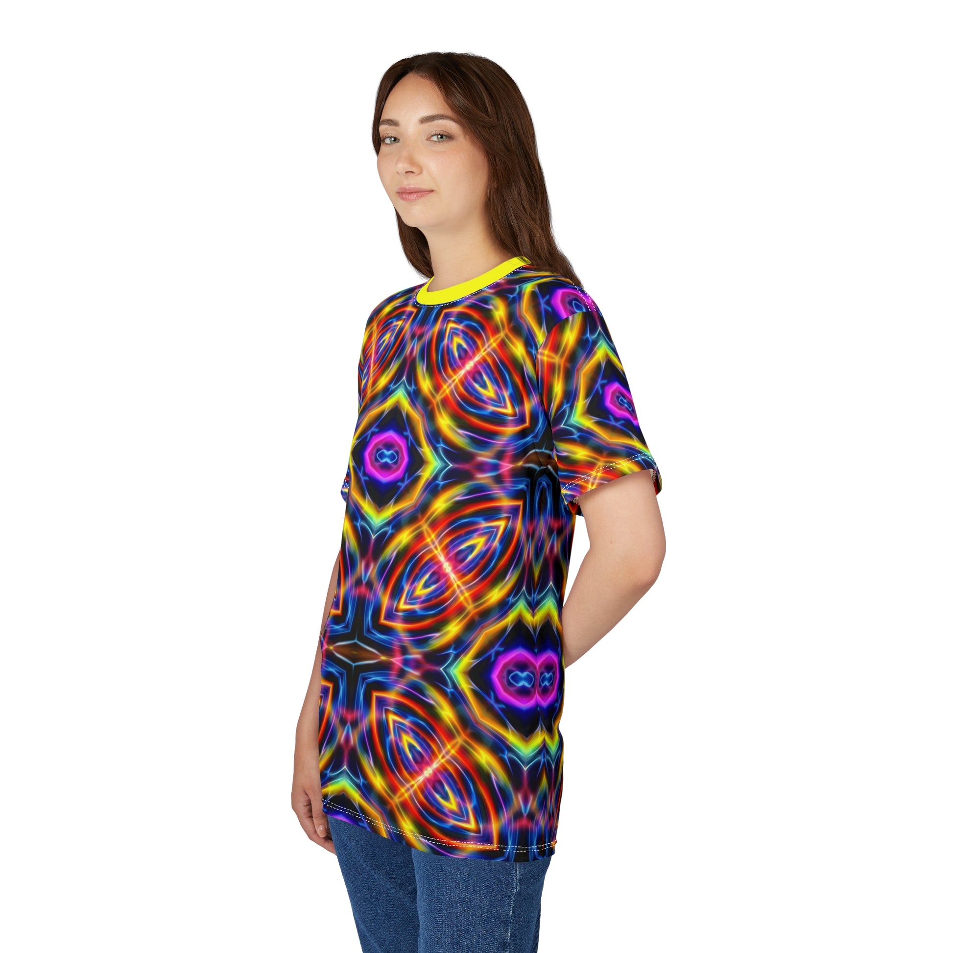 Step into the cosmic current with the Auric Motion T-Shirt, a wearable conduit of frequency and flow. This all-over print masterpiece pulses with vibrational waves of color, an electrified dance of neon blues, fiery reds, and golden yellows cascading across the fabric like an aurora in motion.